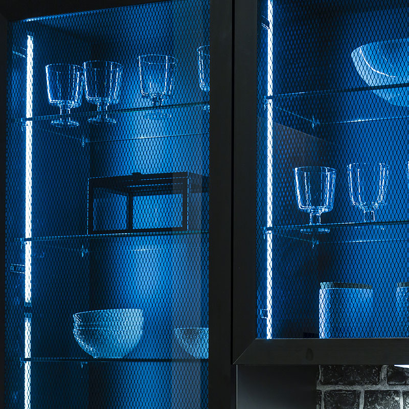 Een ruim fornuis van Smeg, blauw verlichte zwarte glaskasten en een zeer ruime kastenwand met stijlvolle industriële fronten maken deze ruime leefkeuken compleet.