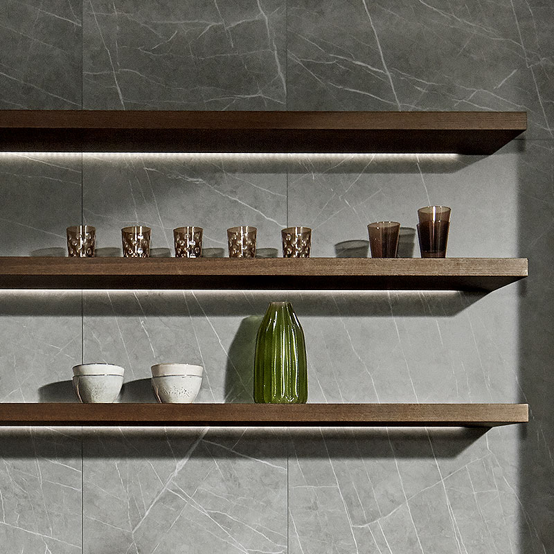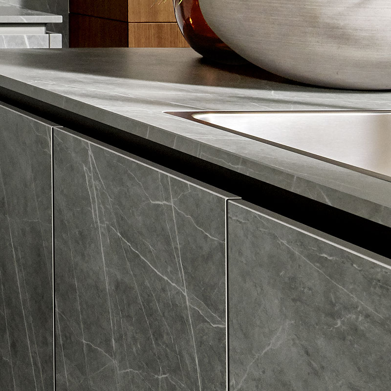Horizontale lijnen en het gebruik van pure materialen versterken het gevoel van eenheid. Zo ontstaat een keuken waarin u de kracht van de natuur ervaart, gecombineerd met het comfort van eigentijds design.