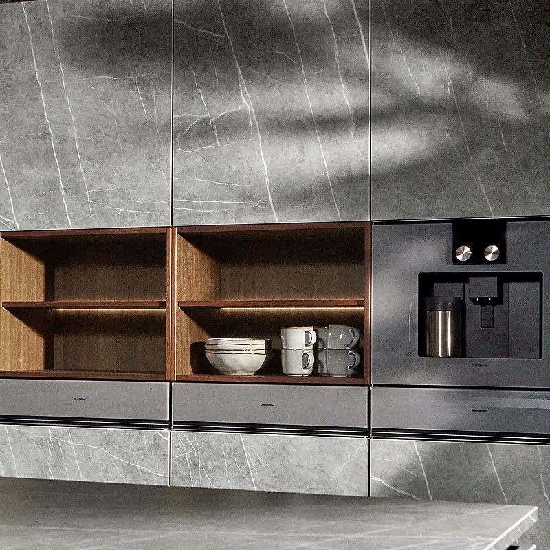 Het eiland lijkt uit één blok gehouwen en straalt rust en kracht uit. Tegelijk maken de open vakken en de houten bar het geheel uitnodigend en functioneel. Hier kunt u koken, genieten en samenzijn in een ruimte die in balans is.