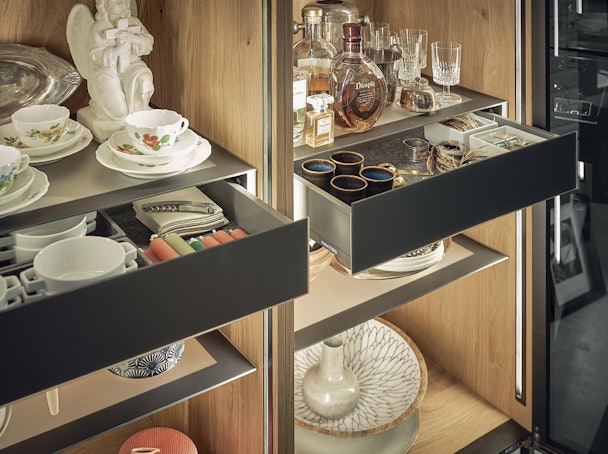 De schitterende uitstraling van de vitrinekast komt ook tot uiting in de kastinrichting. Zo beschikt de kast over gesatineerde glazen legplanken met onyxzwarte passe-partouts. Deze weerspiegelen onmiskenbaar de hoge designeisen en liefde voor details van next125. Maar ook over functionaliteit hebben de designers goed nagedacht. Want door middel van gesloten lades zijn er verborgen opslagruimte gecreëerd. Deze geïntegreerde binnenladen en -korven zijn bovendien voorzien van hoogwaardige inlegmatten van gevormd vlies. Hiermee bieden ze de ideale opbergruimte voor kleine voorwerpen die niet direct zichtbaar moeten zijn. Daarnaast hebben de onyxzwarte glazen fronten van de lades een Tip-om push/pull-openingsmechanisme.