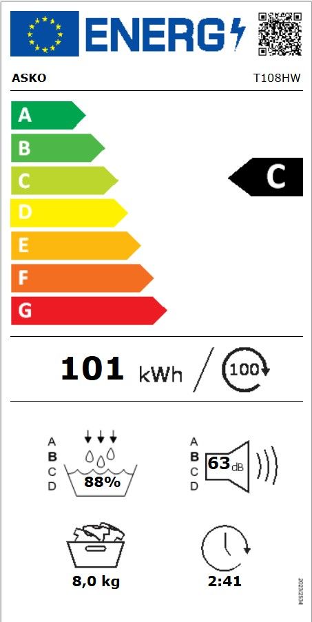 De ASKO T108HW heeft energieklasse C. Deze klasse wordt gebaseerd op het zuinige eco droogprogramma die je dan ook terugvind op elke wasdroger. Dit programma is bijzonder milieuvriendelijk. De wasdroger gaat tijdens dit programma het meest efficiënt om met energie.
