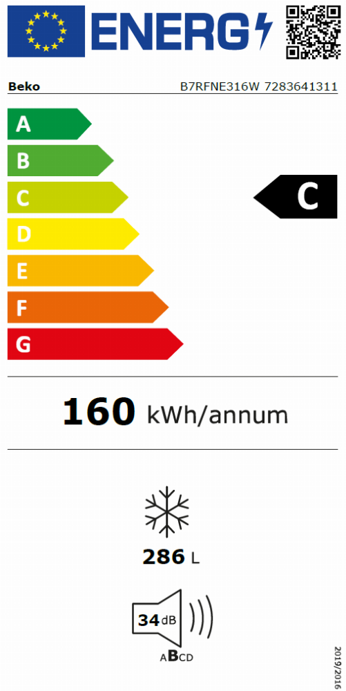 De Beko B7RFNE316W heeft energieklasse C. Bij het bepalen van het energielabel wordt rekening gehouden met het volume van de koelkast. Het energieverbruik wordt vervolgens per liter van de koelkast gemeten. Zo kunnen ook grotere koelkasten in een goede energieklasse vallen.